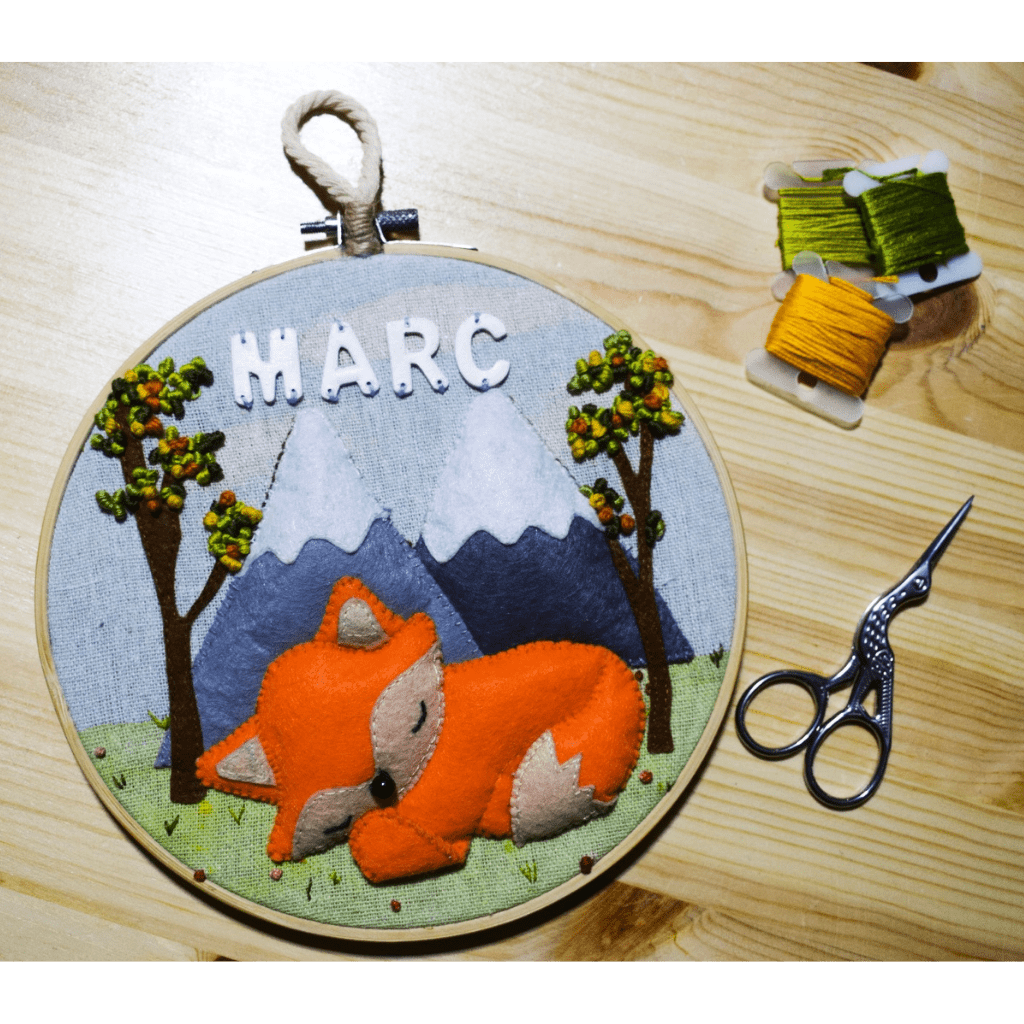 Bastidor bordado a mano, realizado con tela de algodón y fieltro.